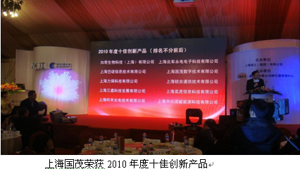 2011年1月18日,在上海張江(集團(tuán))有限公司舉辦的“2010年度張江創(chuàng)新風(fēng)云盛典”上,上海國茂數(shù)字技術(shù)有限公司榮獲“2010年度十佳創(chuàng)新產(chǎn)品獎(jiǎng)”,公司總經(jīng)理王國中上臺(tái)領(lǐng)獎(jiǎng)并應(yīng)邀作為唯一的獲獎(jiǎng)企